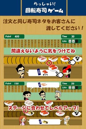 回転寿司ゲームではステージをクリアすると、より難易度が高くなる次のステージへと進むことができ、最初は1つの注文に合った寿司を1つのレーンから取って提供していたのが、注文される寿司の数やレーンの数が2つに増え、どんどん忙しくなり、よりスリル満点なゲームが楽しめます。ステージは全部で6ステージあるので、最後のステージをクリアできるようになれば、あなたは真の回転寿司ゲームマスターでしょう。
