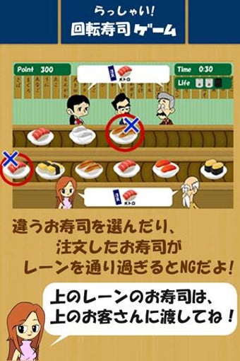 回転寿司ゲームは、速く流れるレーンの上に乗っている寿司を、お客の注文に沿って提供しながら集中力と反射神経を鍛えられるアクションゲームアプリです。